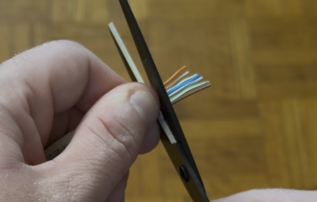 Use the stripping blade on your crimping tool (or a dedicated wire stripper) to remove 5–10 cm (2–3 inches) of the outer jacket from both ends of the cable. Be careful not to nick the internal wires.